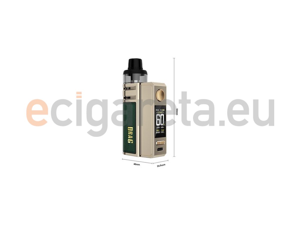 VooPoo Drag E60 Pod Kit je praktická a kompaktní e-cigareta, která zaujme nejen kapesními rozměry, ale také nabušenými funkcemi. Hlavní výsadou jsou však právě tyto rozměry, díky kterým ji snadno uložíte do kapsy a v dlani ji během užívání ani neucítíte. Rozměry těla činí 94 x 46 x 24,9 mm, k dostání je v šesti barvách s konstrukcí z kombinace zinkové a hliníkové slitiny s ekokoženým potahem v zadní části.