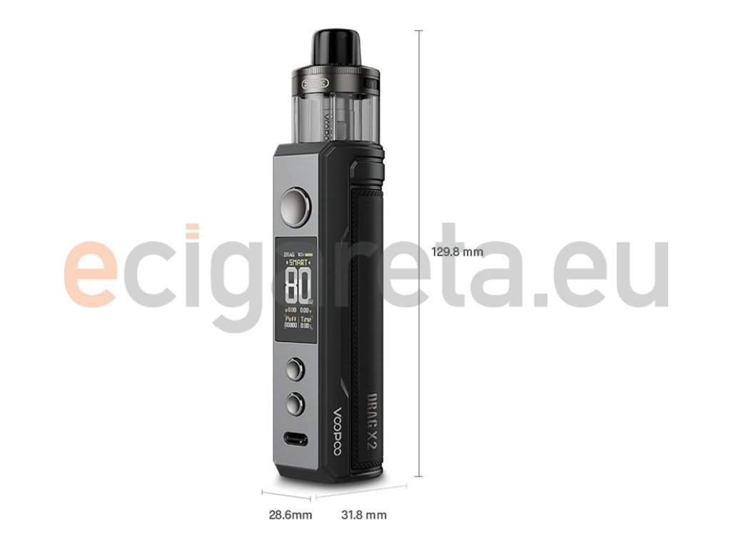 Populární design série Drag je zpět, model VooPoo Drag X2 nabídne ergonomicky vyváženou konstrukci z kvalitních materiálů pro co nejpohodlnější používání. Celkové rozměry e-cigarety se zastavily na 129.8 x 31.8 x 28.6 mm. V dlani potom působí bytelným a luxusním dojmem, k dostání je navíc v celé řadě barevných variant.