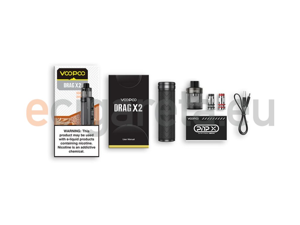 Druhá generace populárních modelů e-cigaret Voopoo Drag S a Drag X přináší celou řadu vylepšení v čele s upgradovaným čipsetem, přepracovaným rozhraním, podporou většího množství režimů, větším objemem a novou platformou PnP-X pro co nejlepší výsledky při vapování. Verze VooPoo Drag X2 Pod Kit nabídne elegantní a moderně zpracované tělo ze zinkové slitiny a kůže. Samozřejmostí jsou potom opět praktické rozměry a ergonomicky zaoblené hrany v zadní části pro komfortní stisk v dlani. Tělo zařízení ukrývá slot pro vlastní baterii typu 18650. Díky pohonu na externí baterii si dokáže model Drag X2 poradit s výstupním výkonem až 80 W. Externí baterii potom můžete pohodlně dobíjet také přímo v těle e-cigarety díky USB-C portu s podporou 2A nabíjení v přední části.