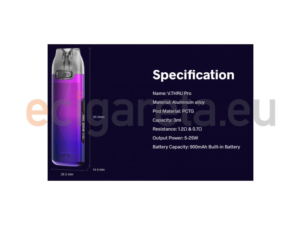 Není určeno pro náplně obsahující nikotin! Elektronická cigareta VOOPOO V.THRU Pro připomíná na první pohled svými rozměry legendární Joyetech Teros, ale svými vlastnostmi je tento kousek absolutní špičkou mezi POD systémy. Odlehčené tělo e-cigarety disponuje vestavěnou baterií o kapacitě 900mAh, automatickým spínačem, nastavitelným výkonem od 5W do 25W a 0,69 palcovým displejem. Vyměnitelné cartridge (POD) o objemu 3ml nabízí dva odpory žhavicích hlav, a to 0,7ohm a 1,2ohm.