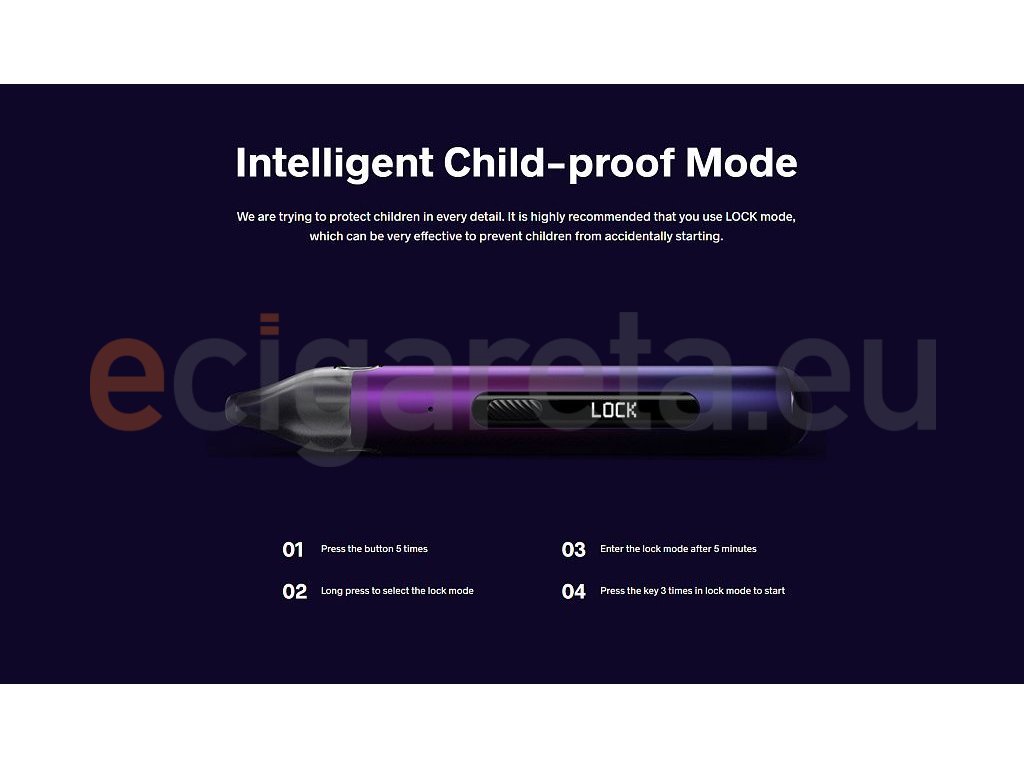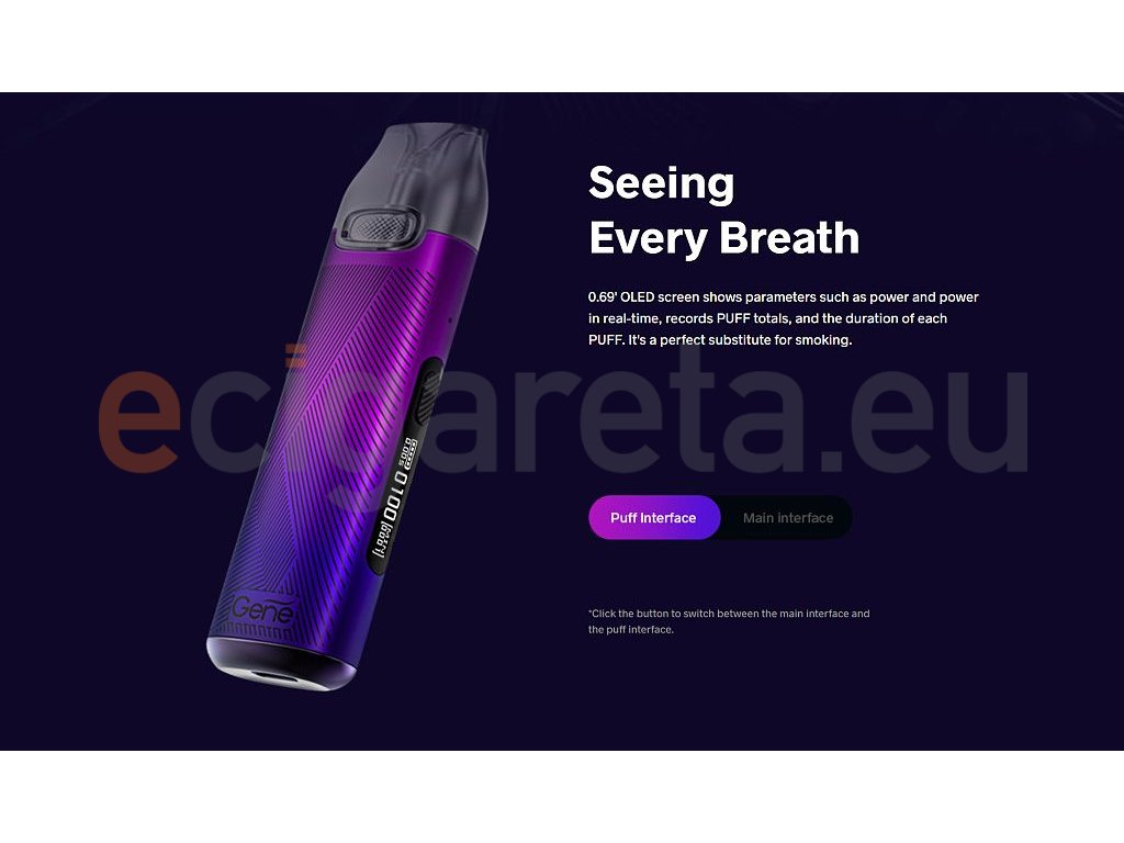 Cigaretu pohání čip GENE, který dodává konstantní výstupní napětí. Těšit se tak můžete na dokonale hladký a příjemný potah, nebo na možnost regulace výstupního výkonu. Ten lze regulovat v rozmezí 5 - 25 W pomocí jednoho jediného tlačítka. Na 0,69 palcovém OLED displeji se zobrazují veškěré potřebné informace o zařízení. Elektronická cigareta disponuje inteligentním režimem dětské pojistky, aby se zabránilo náhodnému spuštění dětmi. Samotná Pod Cartridge disponuje magnetickým uchycením a její doplňování a případná výměna je tak otázkou několika málo vteřin.