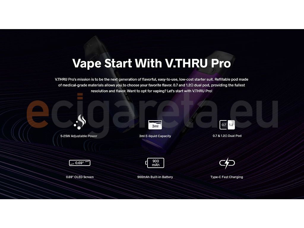 Elektronická cigareta Voopoo V.THRU Pro Kit je snadno použitelná a dostupná startovací sada, který má malé rozměry, ale velký výkon. Je napájena vestavěnou baterií o kapacitě 900mAh s rychlonabíjecím portem typu USB-C 5V/1A. Díky beztlačítkovému ovládání a prvotřídnímu designu se V.THRU Pro snadno používá, přenáší a její konstrukční provedení přináší opravdu příjemný požitek z vapování.
