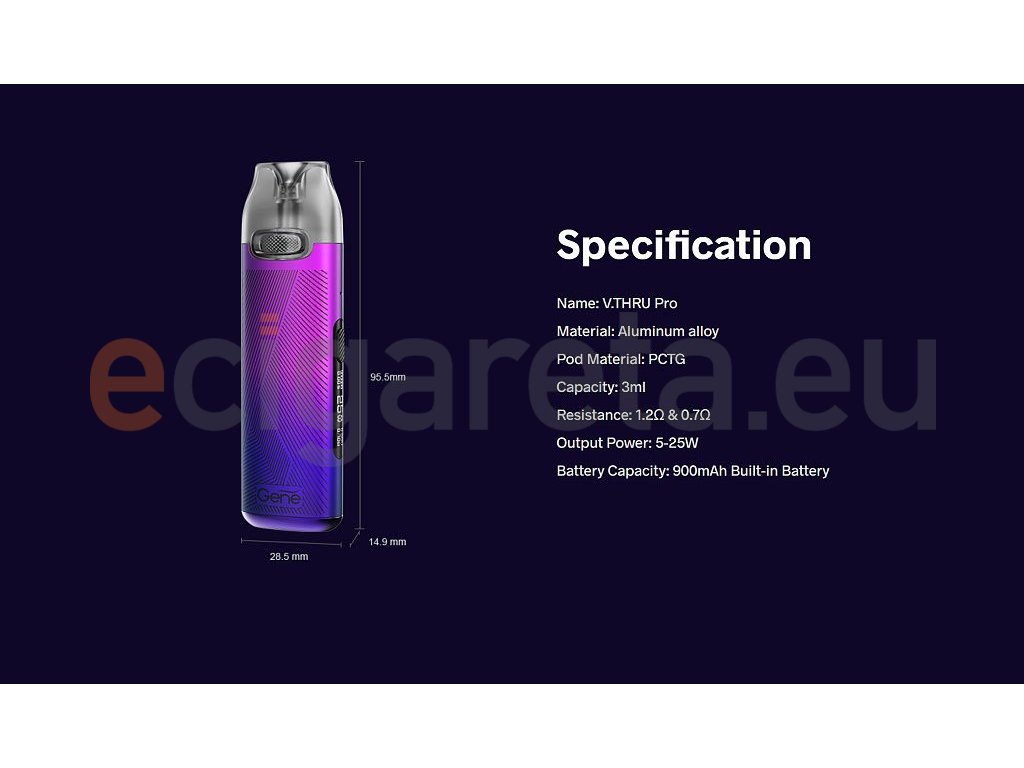 Elektronická cigareta Voopoo V.THRU Pro Kit je snadno použitelná a dostupná startovací sada, který má malé rozměry, ale velký výkon. Je napájena vestavěnou baterií o kapacitě 900mAh s rychlonabíjecím portem typu USB-C 5V/1A. Díky beztlačítkovému ovládání a prvotřídnímu designu se V.THRU Pro snadno používá, přenáší a její konstrukční provedení přináší opravdu příjemný požitek z vapování.