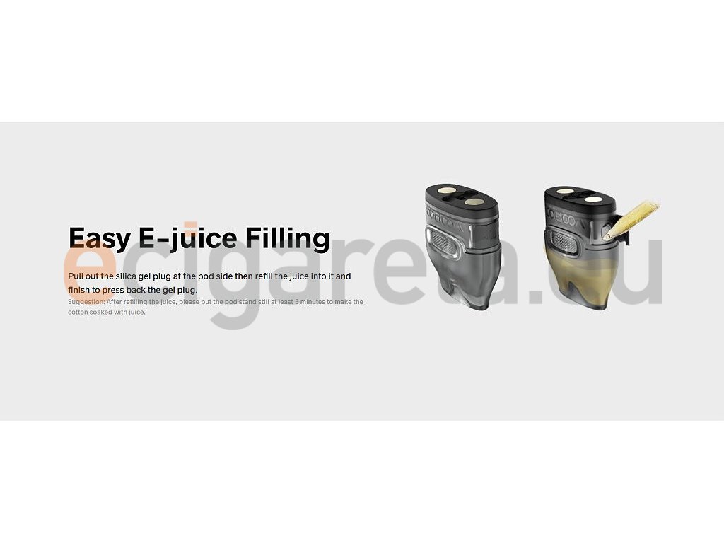 Propracované Pod Cartridge Součástí balení jsou hned dvě Pod cartridge s celkovým objemem 3 ml. Obě cartridge jsou vhodné pro klasické šlukování. První z nich nabídne integrovanou žhavící hlavu s mesh pletivem a odporem 0,7 ohm, která je ideální pro vzdušnější potah. Druhá Pod Cartridge disponuje odporem 1,2 ohm a je vhodná pro utažené MTL. Samotné plnění je velmi jednoduché a probíhá odejmutím boční silikonové krytky, kde se nachází plnící otvor. |