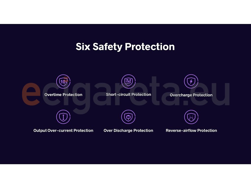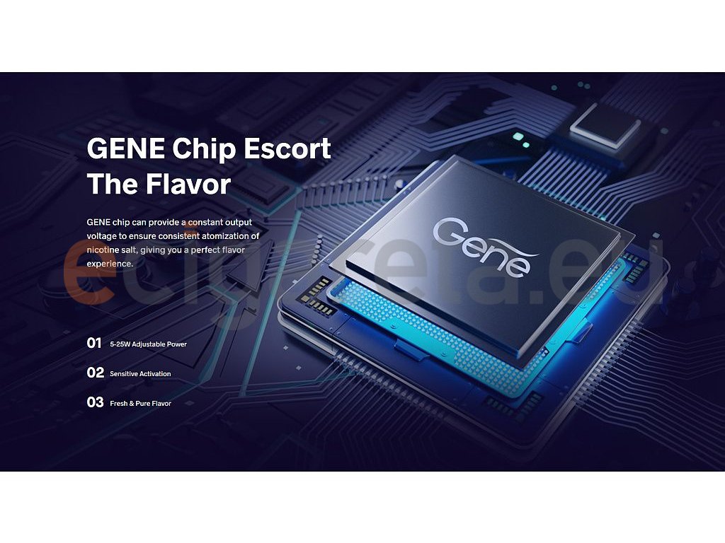 Cigaretu pohání čip GENE, který dodává konstantní výstupní napětí. Těšit se tak můžete na dokonale hladký a příjemný potah, nebo na možnost regulace výstupního výkonu. Ten lze regulovat v rozmezí 5 - 25 W pomocí jednoho jediného tlačítka. Na 0,69 palcovém OLED displeji se zobrazují veškěré potřebné informace o zařízení. Elektronická cigareta disponuje inteligentním režimem dětské pojistky, aby se zabránilo náhodnému spuštění dětmi. Samotná Pod Cartridge disponuje magnetickým uchycením a její doplňování a případná výměna je tak otázkou několika málo vteřin.