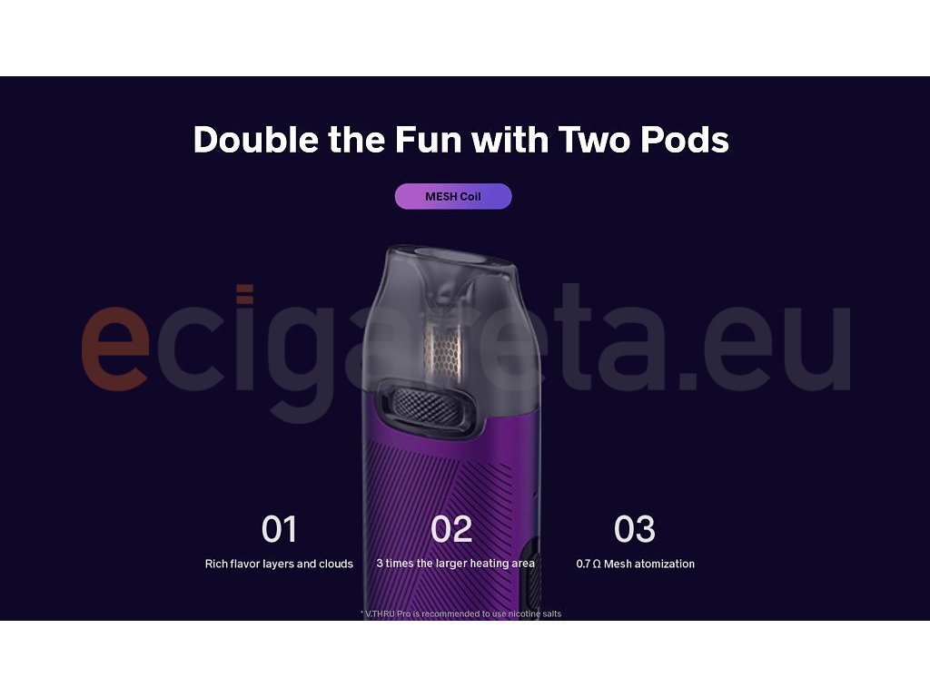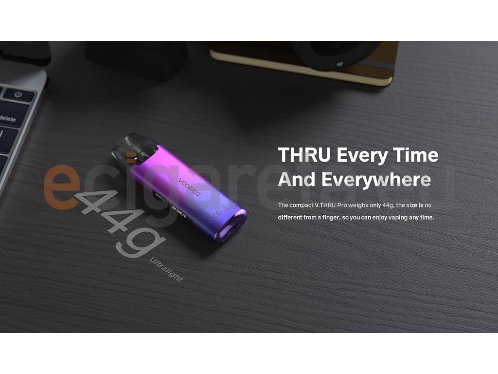 Možnost nastavení výkonu Elektronická cigareta Voopoo V.THRU Pro nabízí vskutku malé rozměry, ale také nízkou hmotnost, díky čemuž jí lze velmi snadno přenášet v téměř jakékoli kapse. Na 0,69 palcovém OLED displeji se zobrazují veškěré potřebné informace o zařízení. Elektronická cigareta disponuje inteligentním režimem dětské pojistky, aby se zabránilo náhodnému spuštění dětmi. Samotná Pod Cartridge disponuje magnetickým uchycením a její doplňování a případná výměna je tak otázkou několika málo vteřin.
