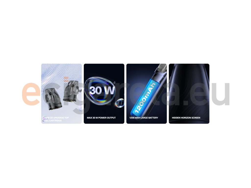 Prémiový výrobce elektronických cigaret VOOPOO představuje svojí ,,vlajkovou POD loď´´ VMATE MAX, která Vás na první pohled oslní svým jedinečným designem. Na přední straně baterie se nachází luxusní OLED displej (Hidden Horizon Screen) pro snadné nastavení a zobrazení hodnot. Vestavěný monočlánek disponuje kapacitou 1200mAh s rychlonabíjením typu USB-C 5V/2A. Moderní čip GENE přináší nastavitelný výkon až 30W a režimy SPT, NOR a ECO. Tato sada s sebou přináší i nové a vylepšené cartridge VMATE TOP FILL s vrchním plněním a autentičtější chutí liquidu.