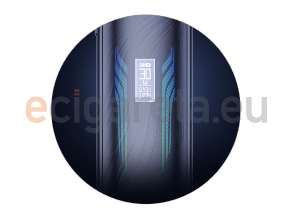 O všech potřebných parametrech budete mít neustálý přehled díky praktickému skrytému displeji na předním panelu. Tento displej je zapuštěn do těla a nevyčnívá, krásně tedy splyne s celou konstrukcí zařízení. Na displeji si můžete snadno ověřit aktuální procentuální stav baterie, nastavený výkon, odpor připojené cartridge, zvolený výstupní režim nebo aktuální počet potahů.