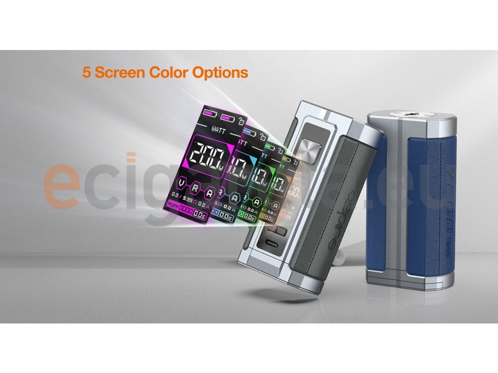 Vysoce výkonný Grip na dvě baterie typu 18650 ze zinkové slitiny a kůže. Výkon až 200W, režimy VW, VV, Bypass, TC, TCR, CPS, počítadlo potahů, možnost změny barvy TFT displeje, závit 510, USB-C nabíjení, ASP čip s řadou ochranných prvků. Clearomizer Aspire Guro 4-5 ml součástí SETU.