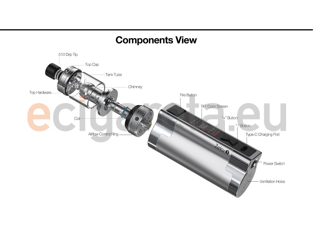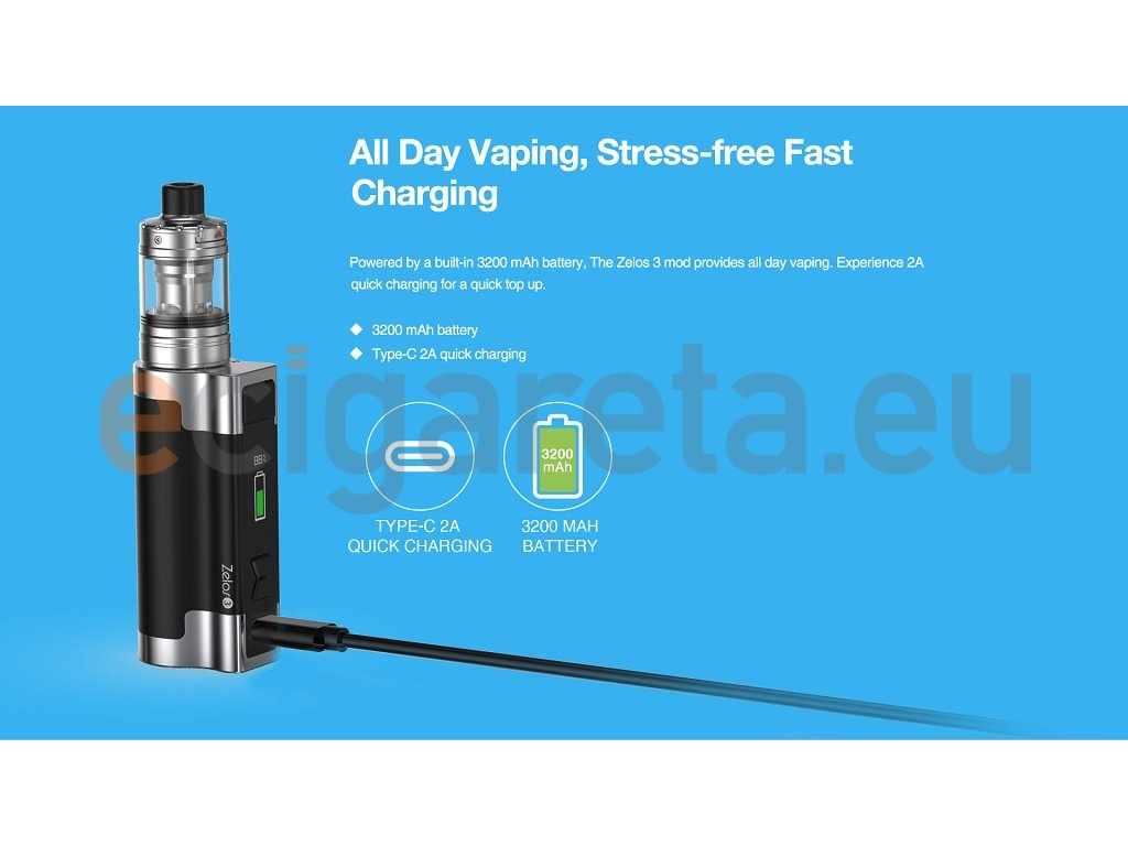Výkonný SET Gripu Aspire Zelos 3 a Clearomizeru Aspire Nautilus 3, vyrobený z lehké zinkové slitiny, disponující vestavnou baterií s vynikající kapacitou 3200mAh. Nastavitelný výkon 1-80W, režimy VW, VV, Bypass, TC, TCR, CPS. Objem Clearomizéru 2ml, propracované Airflow, možnost použití jak MTL, tak DL, podpora žhavících hlav Nautilus BVC, 2x žhavící hlava v SETU.