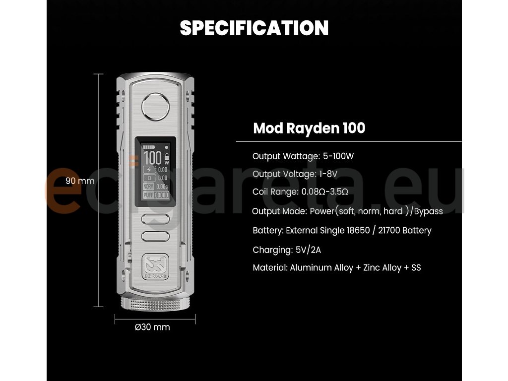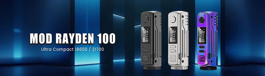 Rayden nabízí variabilní výkon 5-100W s režimy soft, normal a hard pro různé styly žhavení. Podpora odporů 0,08-3,5 ohmu umožňuje širokou kompatibilitu s atomizéry.