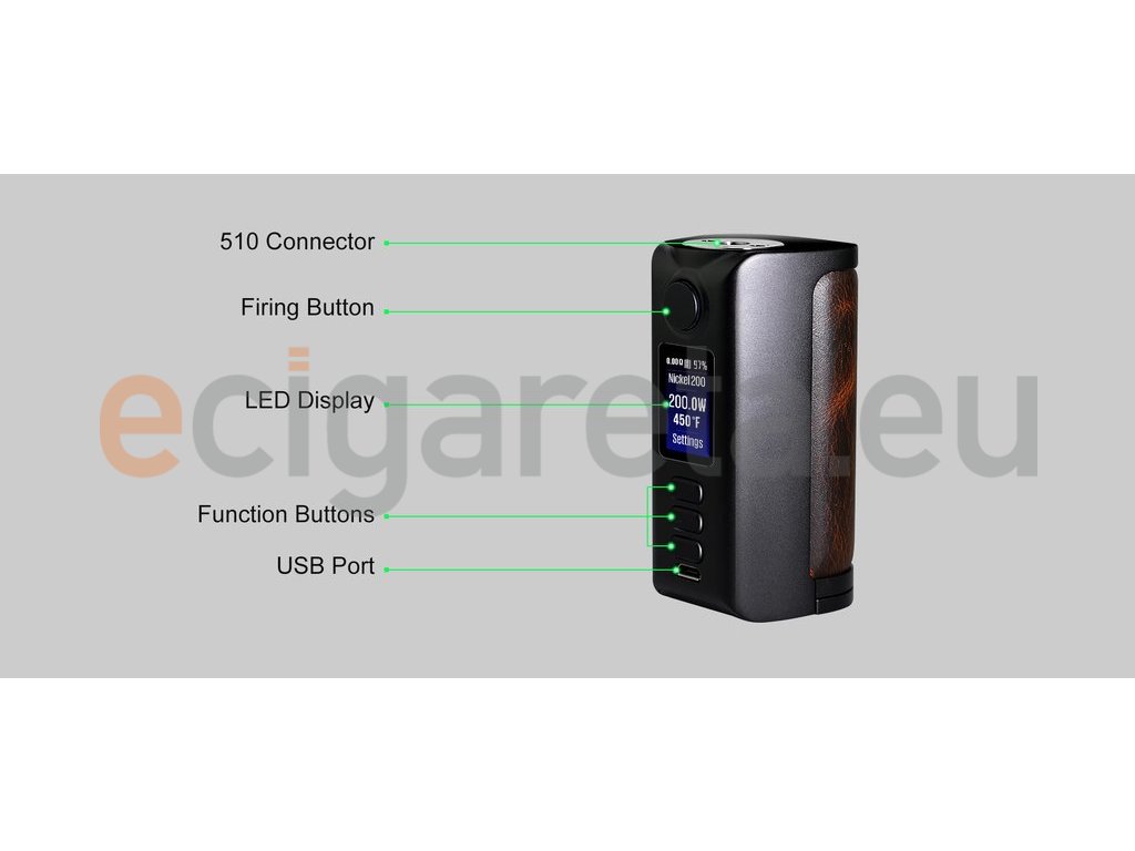 Vysoce výkonný Box Mod s DNA čipem Evolv DNA250C, přímá regulace příkonu, regulace teploty a vyvážené nabíjení, slitina zinku + kůže, slot na 2 baterie 18650, TFT displej, micro-USB nabíjení, režimy VW, TC, Replay.