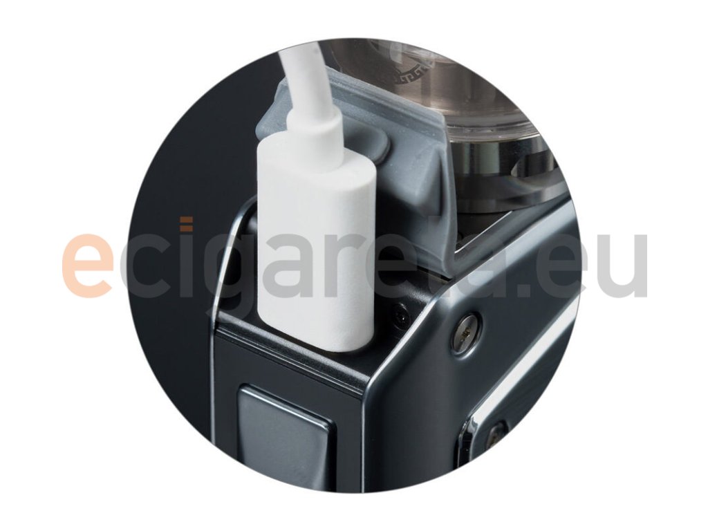 Uvnitř těla se nachází slot pro vložení baterií. Mod pracuje se dvěma bateriemi typu 18650. Tyto baterie nejsou součástí základního balení a je nutné dokoupit je samostatně. Díky pohonu na externí baterie dosáhnete vždy mimořádných výsledků při žhavení, těšit se můžete také na extrémně rychlou odezvu žhavení a stabilní chod zařízení. Externí baterie navíc můžete pohodlně dobíjet přímo v modu díky USB-C portu na těle zařízení.