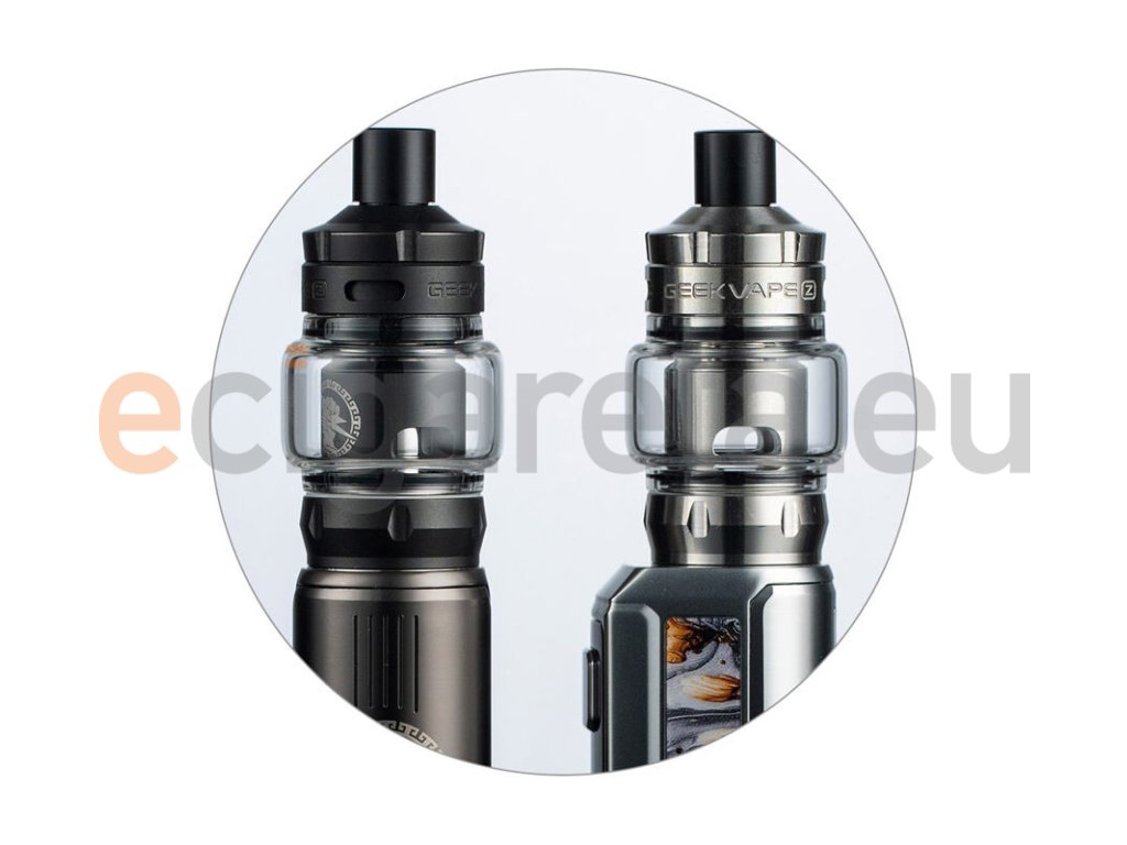 V kompletní sadě se nachází clearomizér Z Nano Tank, jedná se o novou verzi původního clearomizéru Zeus Nano Tank. Nabídne praktický systém vrchního plnění a vrchní regulaci přísunu vzduchu. Jeho objem činí 3,5 ml, v základním balení najdete ještě rovné náhradní sklo s objemem 2 ml. Clearomizér zprostředkuje mimořádný chuťový zážitek pro oba typy vapingu.