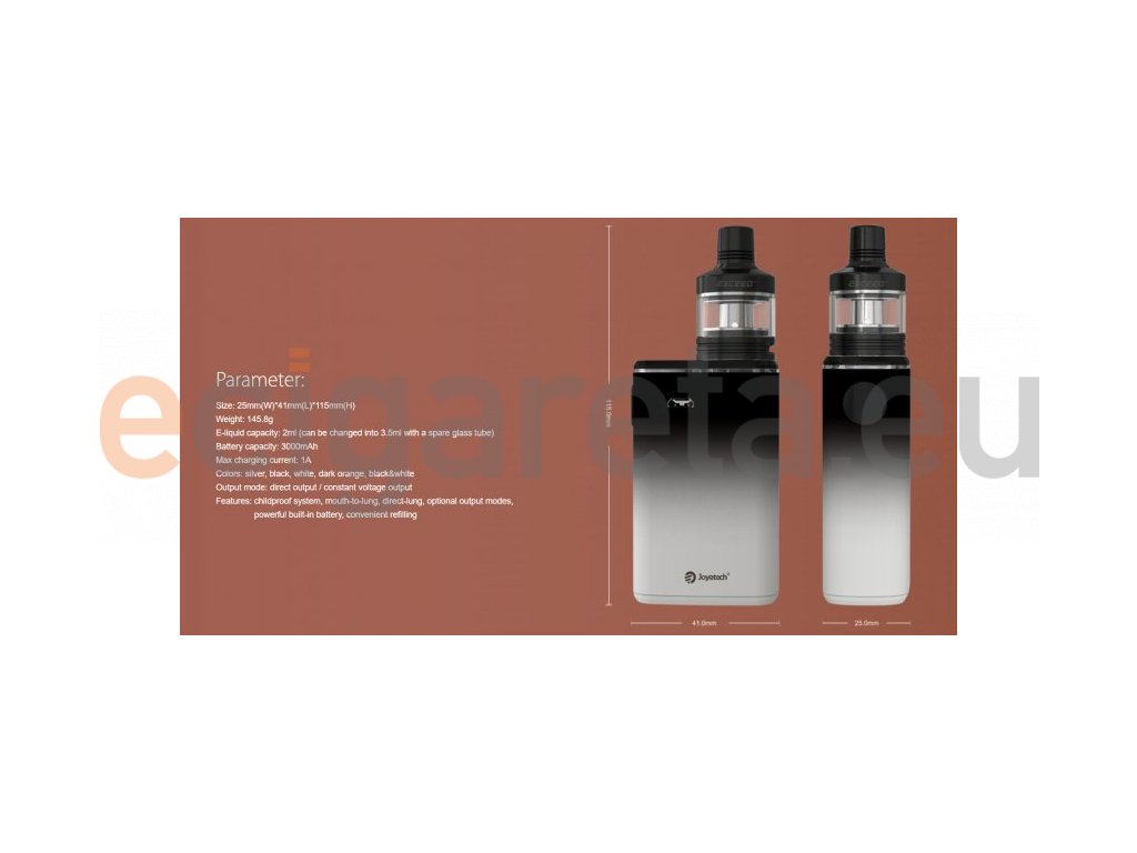 Joyetech představuje kompaktní a výkonný grip, který disponuje vestavěnou vysokokapacitní baterií o objemu monočlánku 3000mAh. EXCEED BOX nabízí režimy přímého a konstantního napětí. Přímé napětí Vám automaticky upravuje výkon cigarety na základě stavu nabití baterie, zatímco konstantní napětí dává stálý výkon bez ohledu na stavu nabití baterie. K přepnutí režimu stačí jednoduchý trojklik žhavicího spínače. Designový LED indikátor stavu nabití je umístěn na vrchní části gripu - stejný princip jako u ecigarety EXCEED D19. Mezi jeho další přednosti patří ochrana proti nízkému odporu a napětí či ochrana proti zkratu. Součástí sady je clearomizer EXCEED D22C. Jedná se o vylepšenou verzi původního modelu o dětskou pojistku proti nechtěnému otevření. Spolupracuje s novými atomizery EX, které přinášejí dokonalou souhru autentické chuti liquidu a velké kouřivosti. Využívá systém horního plnění - po odšroubování vrchní části plníte liquid přímo do těla clearomizeru o objemu 2ml nebo 3.5ml (dle typu zvoleného Pyrex těla). Žhavicí hlavy EX nabízí dva odpory 0.5Ω (přímé potahování) a 1.2Ω pro ústa-plíce. Celý clearomizer je plně rozebíratelný = snadná údržba. Regulace přívodu vzduchu pro nastavení optimální kouřivosti se nachází ve spodní části.