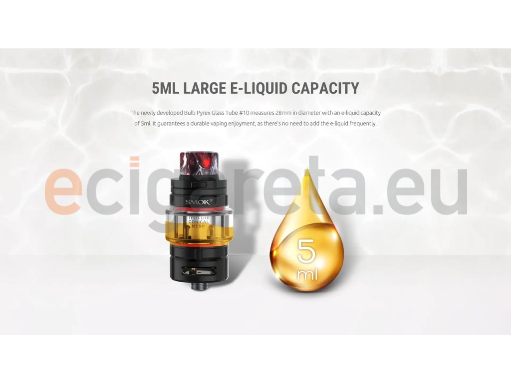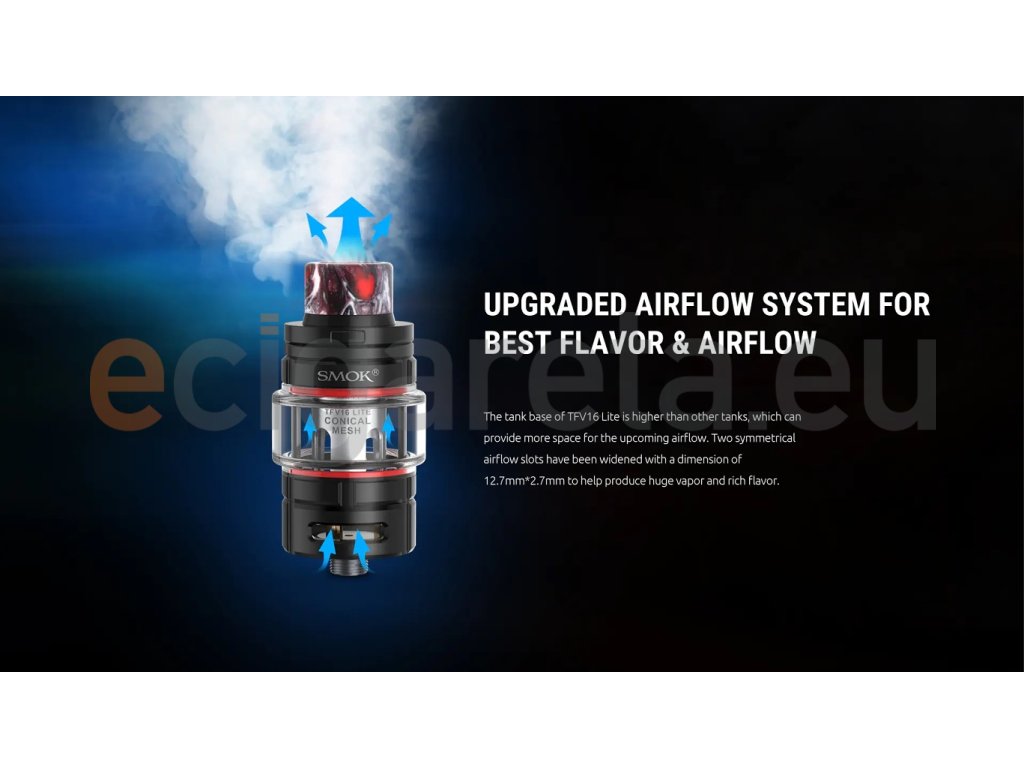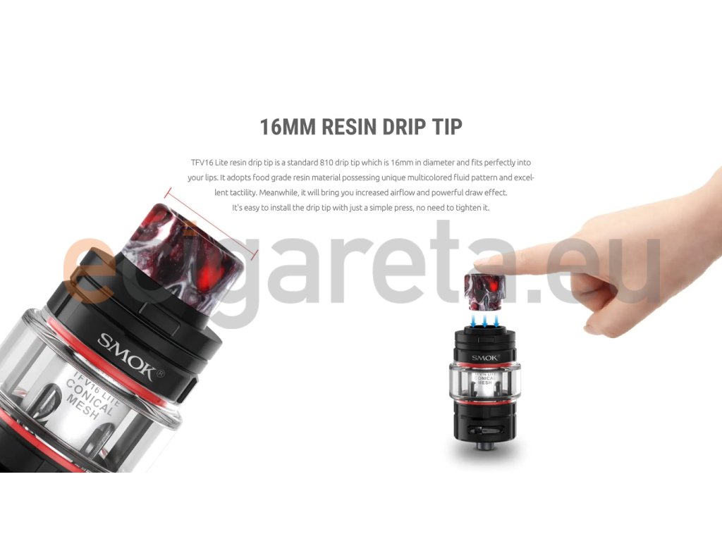Samotnou kapitolu pak představuje Nízkoodporový Tank clearomizer Smok TFV16 Lite, který je součástí tohoto setu. Clearomizer Smoktech TFV16 disponuje objemem celých 5ml zásobního prostoru pro e-liquid. Zároveň s tímto clearomizerem přichází zcela nové žhavící hlavy nesoucí stejné označení TFV16, které jsou osazeny hitem poslední doby, a to Mesh spirálkami, díky kterým se dá dosáhnout opravdu velké produkce páry. Samozřejmostí je pak možnost regulace přívodu vzduchu. Průchod může být také téměř celkově uzavřen. Díky tomu to provedení je Smok TFV16 primárně určen pro oblíbený styl přímého potahování DL, nicméně v kombinaci se správně zvolenou žhavící hlavou a při vyšším omezení přívodu vzduchu lze snadno použít i pro klasický styl MTL, kdy potahujete jako z klasické cigarety. Plnění e-liquidem je rovněž velmi praktické a probíhá pootočením horní části clearomizeru proti směru hodinových ručiček, kde se skrývá samotný otvor pro plnění.