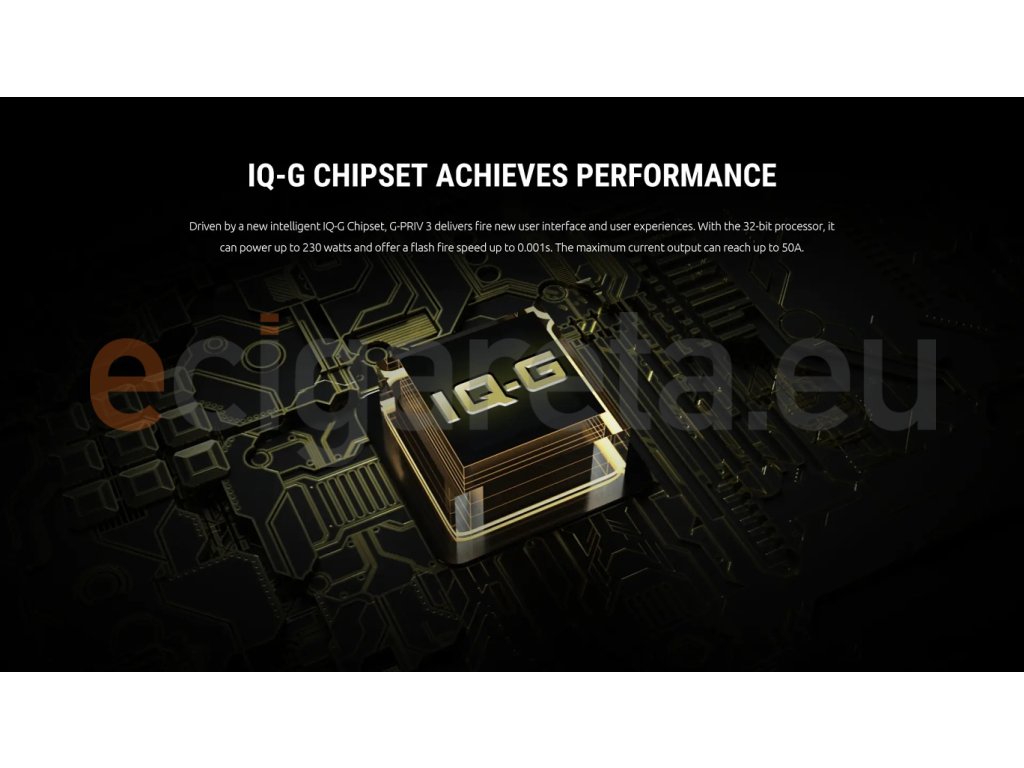 Propracovaný Chipset IQ-G Zařízení si můžete také zabezpečit pomocí hesla, například proti nechtěnému použití dětmi, či jinou osobou. Veškerá tato nastavení i samotný výkon řídí moderní IQ-G chipset, který zároveň nabízí celou řadu ochranných mechanismů, jakými jsou například ochrana proti zkratu, automatická deaktivace žhavení při nechtěném dlouhém stisku 10 sec., inteligentní rozpoznání použitého odporu atomizéru, ochranu proti přehřátí aj.