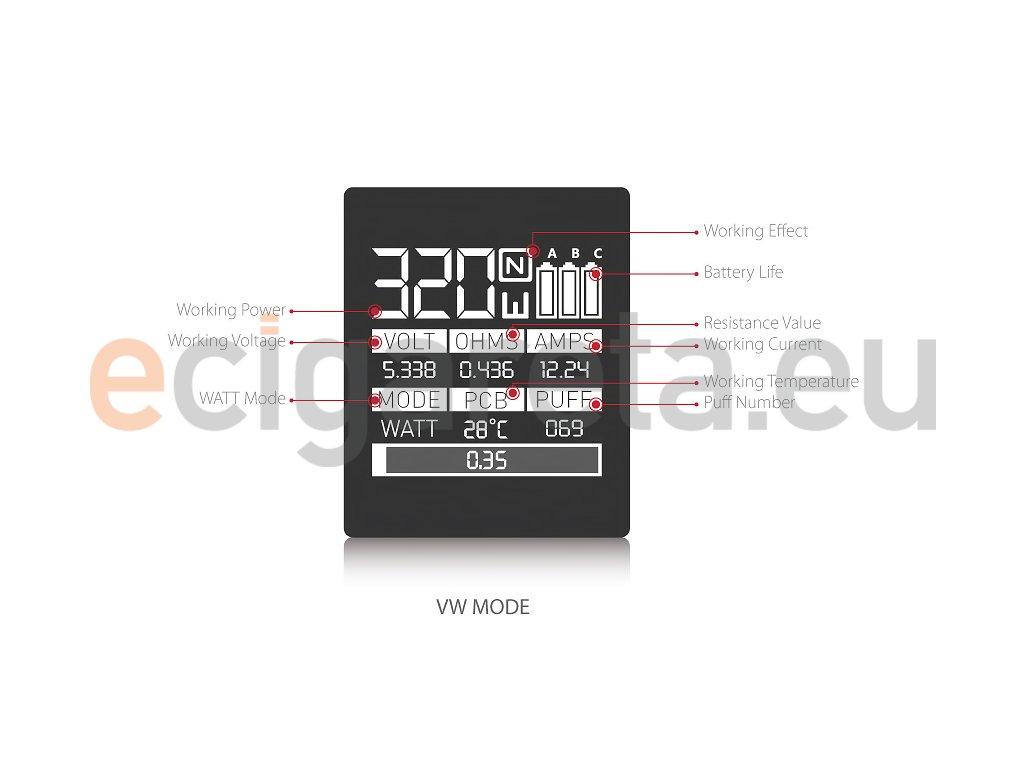 Displej: Zobrazení stavu nabití, odporu atomizeru, aktuální výkon, teplota, napětí, režim, počítání počtu potahů