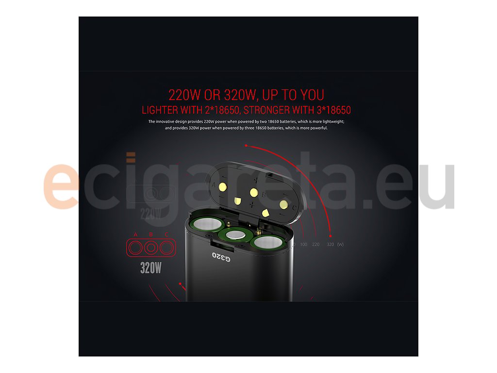 Smoktech G320 Marshal patří mezi menší přístroje pro vaping, ale svým výkonem až 320W se z něj stal bezkonkurenční vítěz mezi vysokovýkonnými gripy. I přes svůj malý rozměr (89,5mm x 61,5mm x 31mm) využívá tři monočlánky typu 18650 (min. 25A), avšak lze použít monočlánky pouze dva, a to s maximálním výkonem až 220W. Vedle klasického VW režimu Marshal disponuje i teplotními mody TC-Ni/Ti/SS a TCR. V horní části je velký OLED displej, který Vás informuje o aktuálním výkonu, teplotě, napětí, odporu, proudu, režimu, počtu potahování a kapacitě baterie bez jakéhokoliv přepínání. Nabíjení umožňuje micro USB vstup.