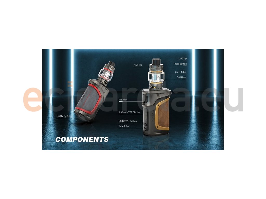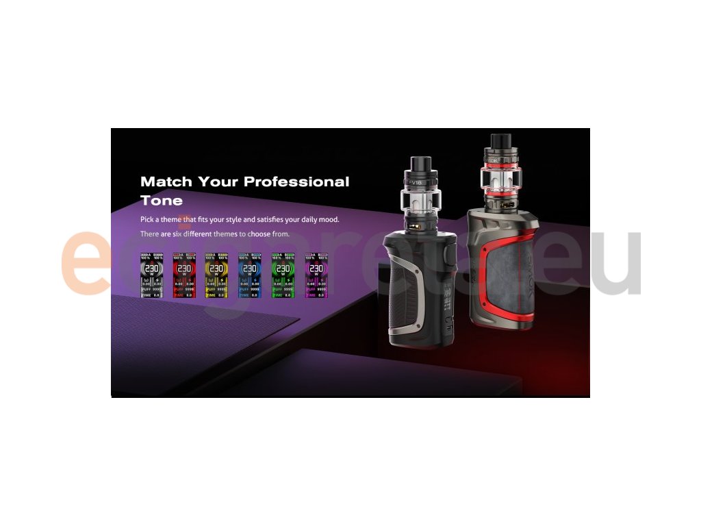 Není určeno pro náplně obsahující nikotin! Smoktech MAG-18 je robustní grip s precizním ergonomickým tvarem, který především ocení milovníci pořádných mraků. Pod tělem baterie, které je vyrobeno ze speciální zinkové slitiny a kůže, se nachází prostor pro dva monočlánky typu 18650. Po zapnutí nás přivítá přehledný 0,96 palcový barevný displej. Mezi tím již MAG-18 aktivoval čip IQ-X, který odpálí výkon až na 230W s rychlým rozžhavením spirály. Mezi jeho další přednosti patří ochrana proti zkratu a přehřátí, historie vapingu, či 8-mi vteřinová ochrana žhavení. Výrobce tento grip osadil clearomizerem TFV18, který zaručuje kvalitní podání chuti, a to díky novým žhavícím hlavám TFV18 Meshed o odporu 0,33ohm a TFV18 Dual Meshed o odporu 0,15ohm. Využívá systém horního plnění - po odsunutí vrchní části plníte liquid otvorem přímo do těla clearomizeru o objemu 7,5ml. Celý clearomizer je plně rozebíratelný = snadná údržba. Regulace přívodu vzduchu pro nastavení optimální kouřivosti se nachází ve spodní části.