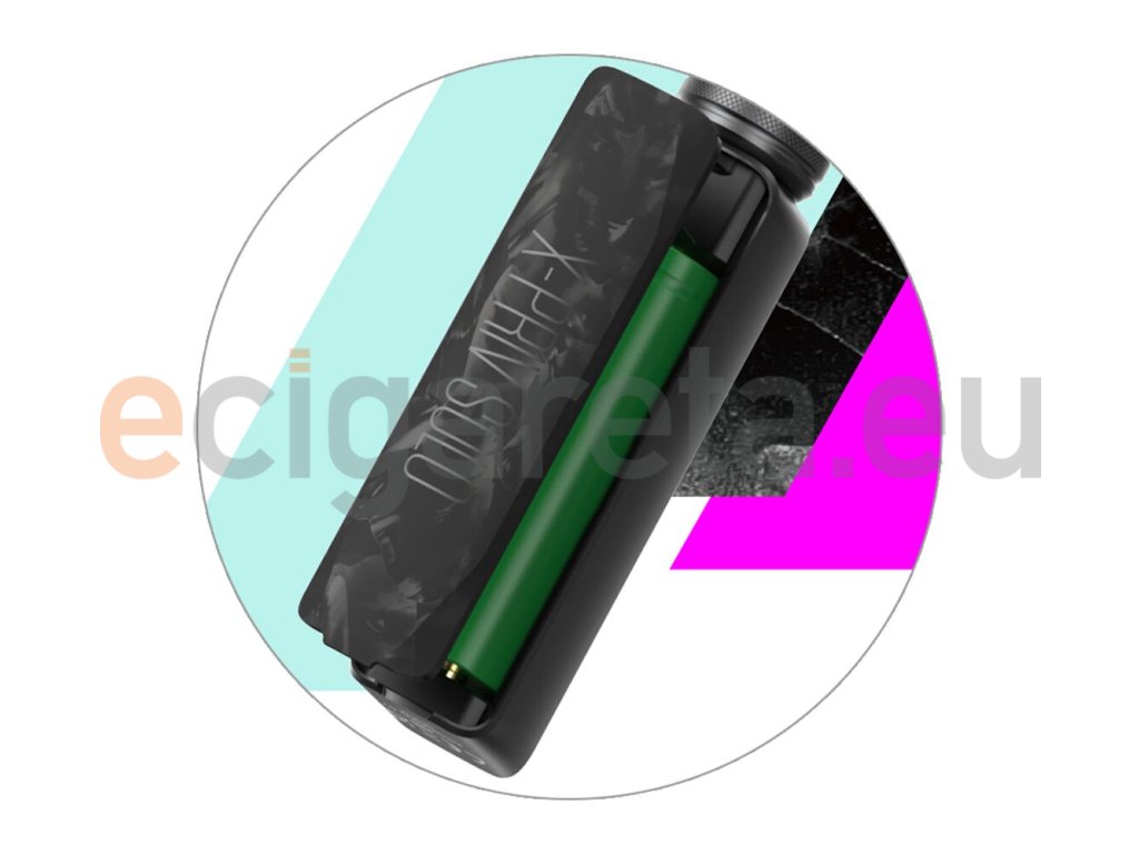 Boční panel se silnými magnetickými úchyty ukrývá slot pro vložení vlastní baterie. Mod pracuje s bateriemi typu 18650. Do těla si tak snadno zvolíte svou oblíbenou baterii tohoto typu dle vašich potřeb a můžete se těšit na obrovský výkon a hladký náběh žhavení s téměř instantní odezvou. Baterii si můžete také pohodlně dobíjet přímo ve vašem modu díky portu USB-C s podporou rychlého nabíjení.