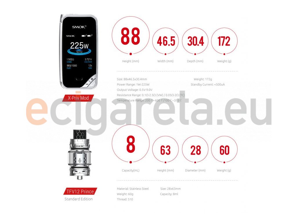 V jednoduchosti je síla. Tímto mottem se nechal inspirovat Smoktech, který vsadil na jednoduché tvary a dle prvního dojmu se jim to vyplatilo. Stále zde nalezneme našlapaný agregát o síle až 225W poháněný 2 bateriemi 18650. Milovníci teploty si také přijdou na své, jak už bývá u dnešních gripů zvykem. X-Priv si snadno spletete s telefonem, jelikož má 2 palcový display a zabírá tak celou stranu gripu. Díky tomu je velice přehledný a vy se tak velice rychle dozvíte všechny důležité informace o nastavení a indikaci baterií. Ty lze nabíjet skrz USB konektor, přičemž Smok dodává vysoce kvalitní USB kabel, který jen přidává na dojmu luxusu. Smok tento grip osadil clearomizerem Prince s konvexní Pyrex nádržkou o objemu 8ml. Tímto spojením si tedy můžete užívat opravdu dlouhého vapování bez rušivých elementů dobíjení a doplňování liquidu. Široký výběr žhavicích hlav obstarávají čtyrspirálkové Q4 a M4, šestispirálková X6, na míru šitá RBA a monstrozní desetispirálkový výrobce páry T10.