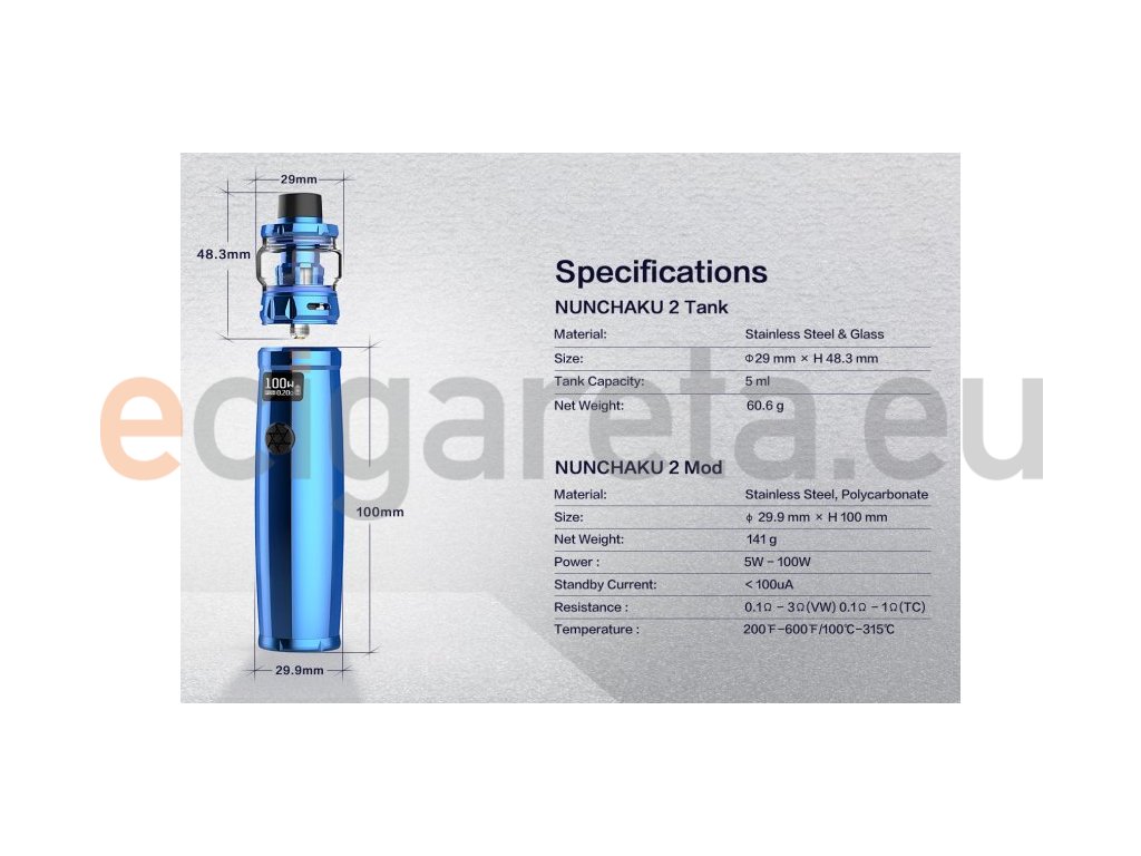 Grip Uwell Nunchaku 2 se vyznačuje především svojí novou konstrukcí a senzorem 6-axis Motion s čipem UWELL BEIN, který se prezentuje pohybovým čidlem pro jednoduché nastavování hodnot výkonu, TCR a Mech modu. Stačí pouze senzor aktivovat a nahnout grip na stranu pro snížení nebo navýšení požadované hodnoty. Díky tomu je Nunchaku 2 ještě kompaktnější. Je napájen jedinou baterií 18650/20700/21700 s maximálním výkonem 100 W. Malý a přehledný displej zobrazuje všechny důležité informace o nastavení. Nunchaku 2 je vybaven ochranou proti zkratu a přebití. K této sadě přiřadil výrobce druhou řadu clearomizeru Nunchaku o objemu 5ml. Nunchaku 2 přináší žhavicí hlavy typu Mesh o odporu 0,14ohm a 0,2ohm. Tyto hlavy jsou plně kompatibilní i s předešlými modely. Využívá systém horního plnění - po odšroubování vrchní části plníte liquid otvorem přímo do těla clearomizeru. Celý clearomizer je plně rozebíratelný = snadná údržba. Regulace přívodu vzduchu pro nastavení optimální kouřivosti se nachází ve spodní části.