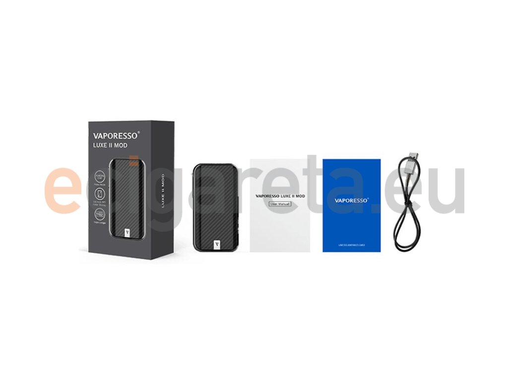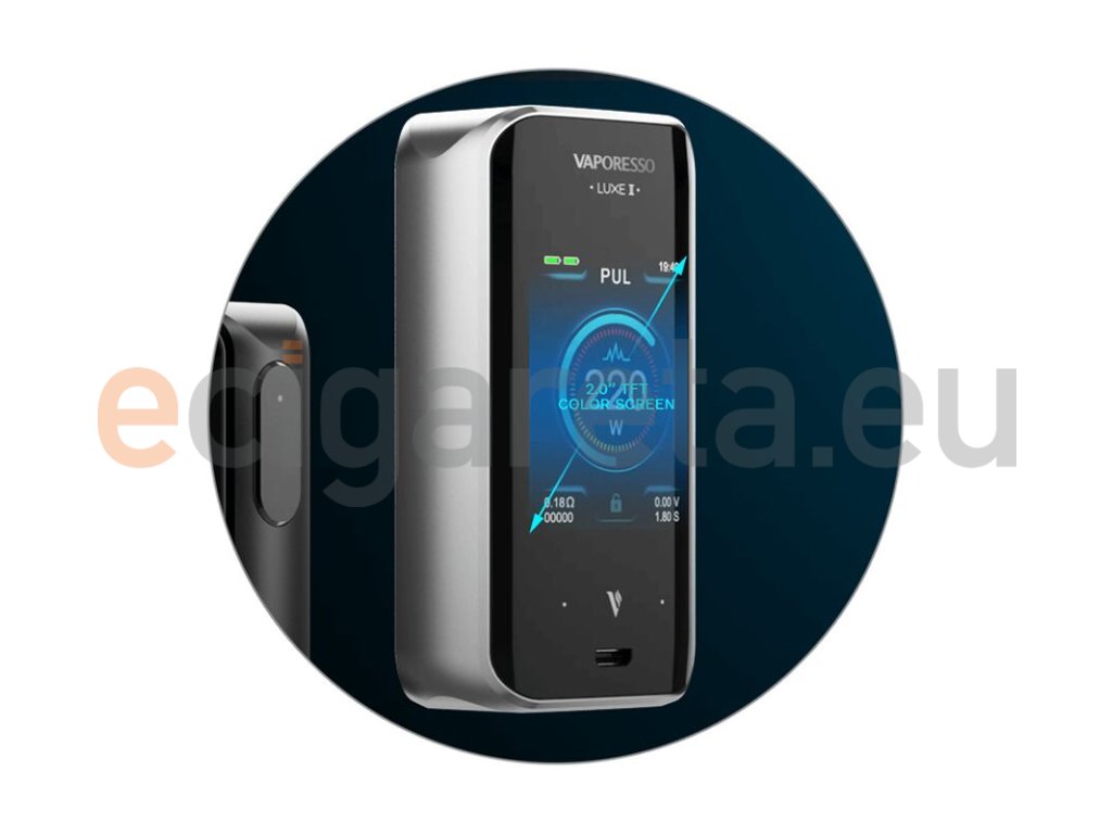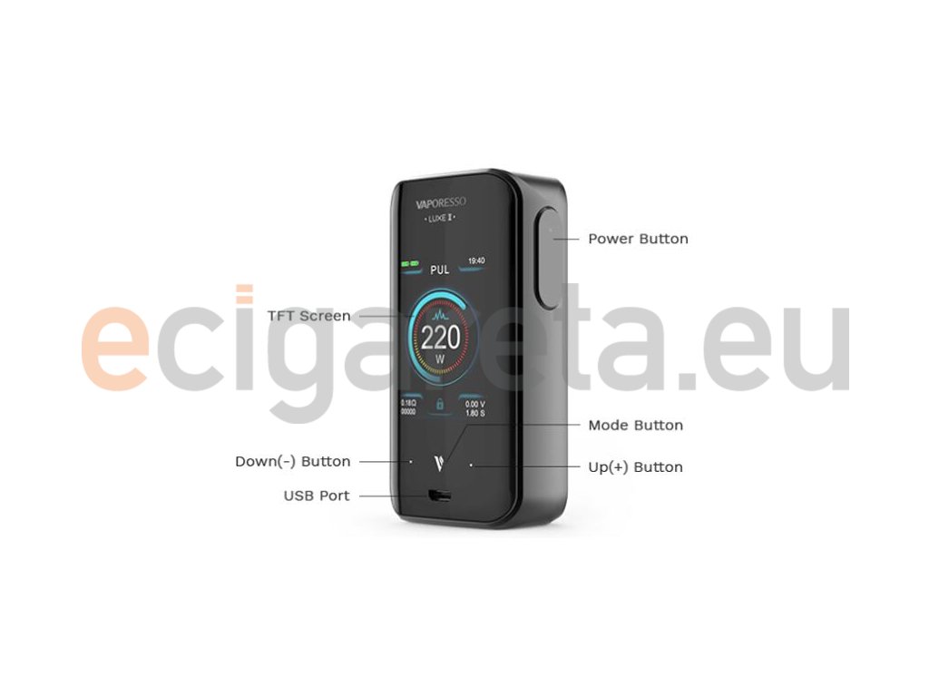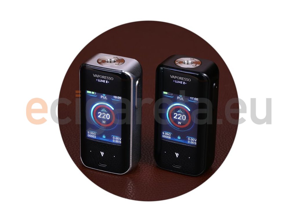 K dispozici je také standardní režim výkonu v rozsahu 5 - 220 W, nebo režim křivky žhavení. V nabídce je také režim ECO pro úsporu vaší baterie. Mod pracuje se dvěma články typu 18650. Tyto baterie nejsou součástí základního balení a je nutné dokoupit je samostatně. Samozřejmostí je potom také možnost rychlého dobíjení baterií přímo v modu díky portu micro USB. Baterie lze dobíjet proudem až 2,5 A. Všechny potřebné parametry nastavíte pomocí postranního panelu s obrovským a čitelným displejem. Uživatelské rozhraní je příjemně intuitivní a s nastavením modu nebudou mít žádný problém ani začátečníci. Vaporesso Luxe II Mod je zkrátka ideální variantou pro všechny vapery, kteří hledají nádherný design ve spojení s nejmodernějšími funkcemi gripů.