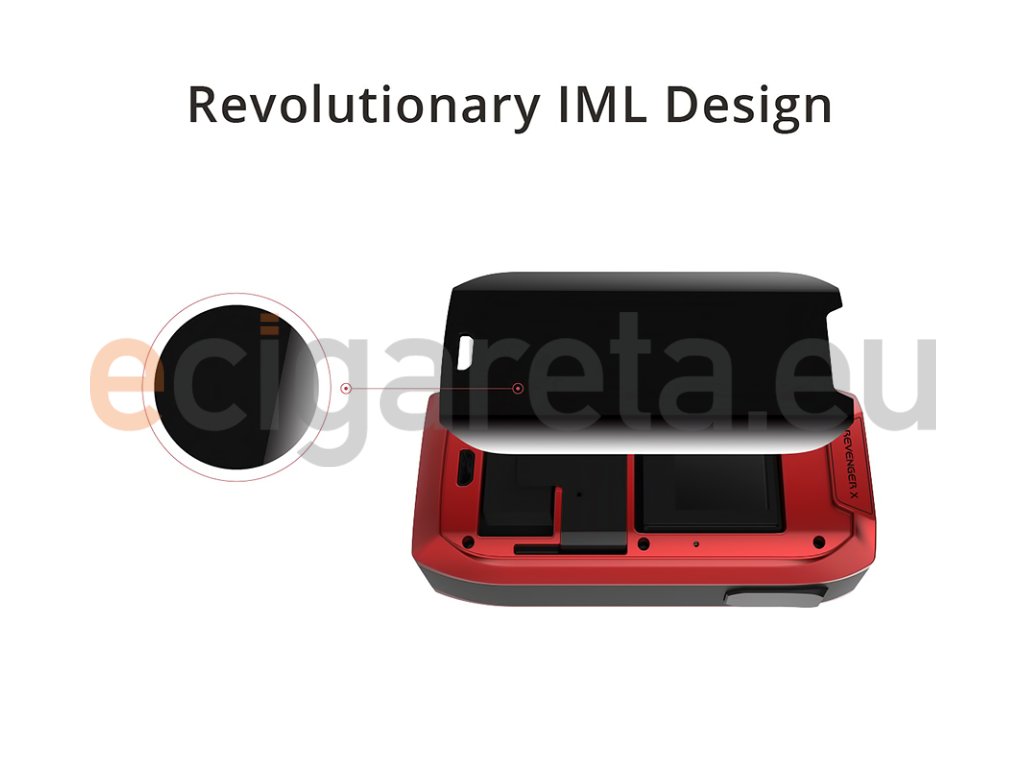 Druhá verze úspěšného gripu Revenger na sebe nenechala dlouho čekat. Revenger X přináší tři zásadní novinky. První dvě se doslova skrývají ve spínači a regulačních tlačítkách. Jedná se o jednoduché ovládání a spínání bez klasických tlačítek. Lehkými stisky na prostřední část gripu (viz foto) si vybíráte požadované funkce, a díky vibračnímu čipu poznáte, že nastavení proběhlo úspěšně. Dotykový senzor spínače je umístěn pod regulátory. Třetí novinka je nastavení jasu 16-ti stupni. Revenger X nabízí velký výběr režimů, od klasického VW (výkon) a TC (teplotní režimy) až po nastavení různých hodnot výkonu či teploty v prvních 5-ti vteřinách potahu. Velký 0,96 palcový displej Vám kromě zobrazení potřebných údajů pro vaping umožní nastavit reálný čas v podobě RTC režimu. Vyměnitelné monočlánky typu 18650 (2ks, min 25A) poslouží jako zdroj energie. V této sadě nalezneme clearomizer NRG Mini o kapacitě 2ml. Využívá systém horního plnění - po odsunutí vrchní části, plníte liquid otvorem přímo do těla clearomizeru. Celý clearomizer je plně rozebíratelný = snadná údržba. Jeho velkou předností jsou žhavicí hlavy GT, které přináší velkou kouřivost a autentickou chuť liquidu. Žhavicí spirálky jsou obaleny v organické bavlně a zapuštěny do keramického těla. Regulace přívodu vzduchu pro nastavení optimální kouřivosti se nachází ve spodní části.