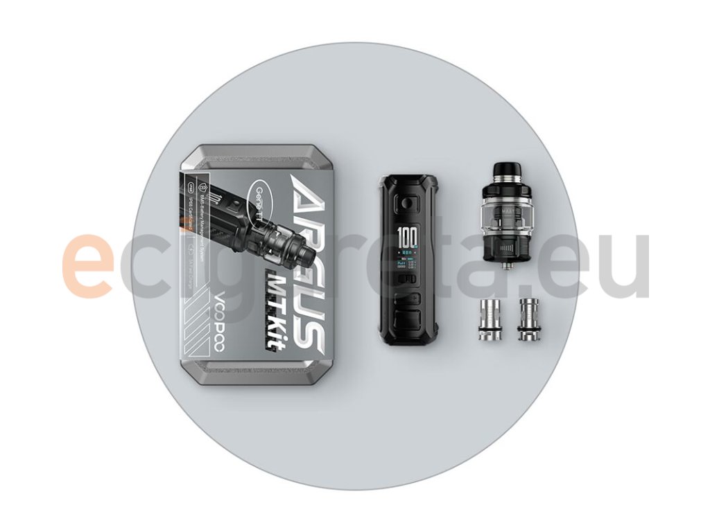 O bezproblémový chod celého modu Argus MT se stará čip GENE TT 2.0. Díky tomuto čipu budete moci využívat jeden ze čtyř praktických režimů a zároveň se můžete těšit na celou řadu bezpečnostních prvků pro hladký provoz. Všechny parametry a hodnoty si nastavíte rychle a snadno na displeji v přední části. Pro ovládání poslouží dvě regulační tlačítka a velké spínací tlačítko. Mod nabídne pokročilý režim SMART, který efektivně měří odpor tělíska a nastaví potřebný výkon při žhavení za vás. V režimu RBA si budete moci libovolně upravovat výkon v rozmezí 5 - 100 W. Milovníci teplotních režimů se mohou těšit na TC (Ni, SS, Ti) a příznivci prudkého náběhu žhavení se mohou těšit na režim TURBO, který zesílí nastavený výkon pro první vteřinu potahu o 25%. Na předním panelu přímo u displeje se potom nachází manuální zamykací tlačítko pro snadné a rychlé uzamčení modu v případě přenášení. V kompletní sadě najdete také oblíbený DL clearomizér s názvem Maat New Tank. Tento clearomizér disponuje obrovským objemem 6,5 ml, nabídne unikátní spodní airflow systém a praktické vrchní plnění. Je kompatibilní s rodinou žhavících tělísek TPP, v balení na vás potom čekají tělíska TPP-DM2 (0,2 ohm) a TPP-DM4 (0,3 ohm). VooPoo Argus MT Kit elegantně doplňuje celou sérii zařízení Argus a přináší zase něco nového.
