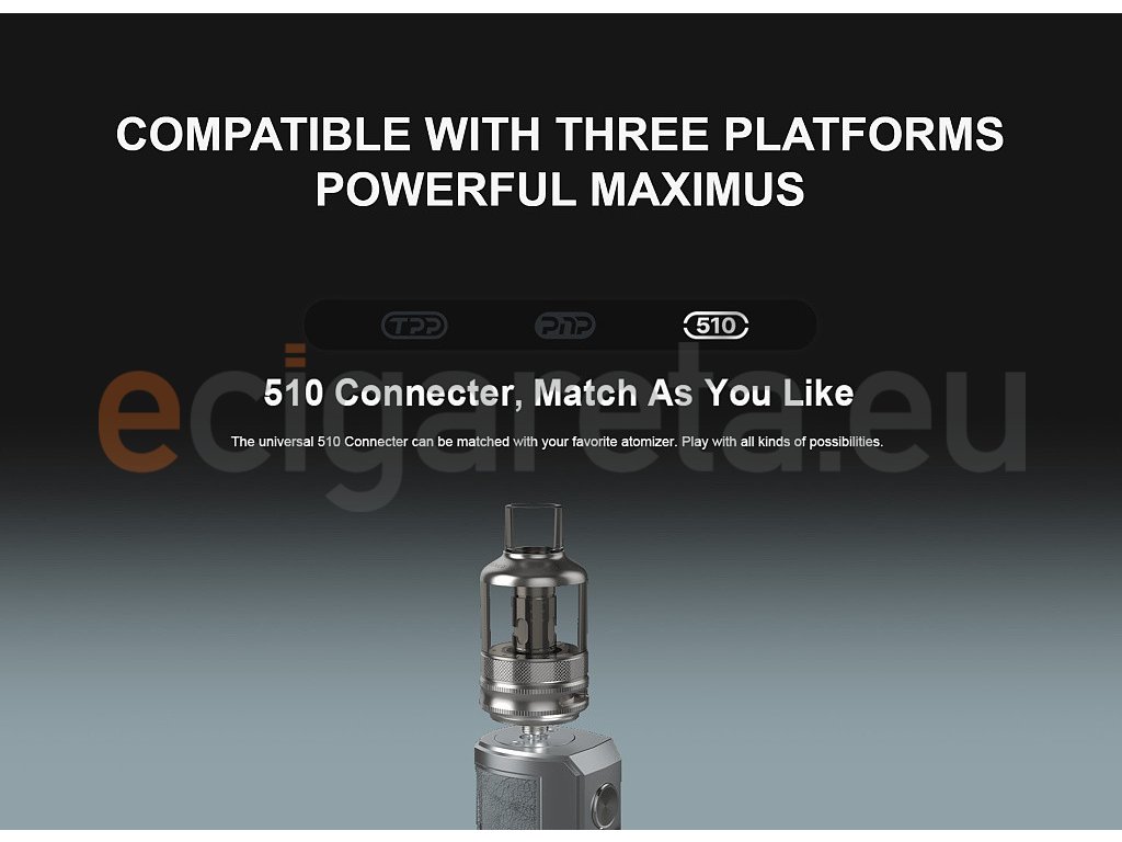 Grip Voopoo Drag 3 disponuje klasickým nejpoužívanějším 510 závitem a lze jej osadit téměř jakýmkoliv Clearomizerem disponujícím stejnou platformou.