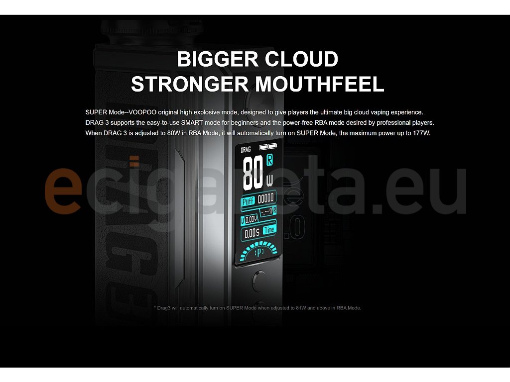 Samotný Grip VooPoo DRAG 3 pohání hned dvě baterie typu 18650 (Nejsou součástí balení). Pokročilý Gene.Fan 2.0 Chip dodává maximální výkon až 177W a celou řadu pokročilých funkcí. Nový chip přináší také bleskurychlé žhavení, a to za rovných 0,001s, kontinuální stabilní výkon a inteligentní režim SMART, který podle odporu použité žhavící hlavy nastaví správný výkon. Tuto funkci ocení především začínající uživatelé, ale i pokročilejší vapeři, kteří nechtějí ztrácet čas složitějším nastavováním. Zcela nový režim SUPER pak dodá okamžitý boost, což zajistí obrovskou produkci páry kdykoliv si budete přát. RBA režim je pak zkratkou pro klasický VW režim s možností nastavení výkonu v rozmezí neskutečných 5 - 177W. Pro opravdové profesionály je pak možné nainstalovat také režim TC (Temperature Control), který můžete získat aktualizací firmware, která je k dispozici na stránkách výrobce VooPoo. Tyto všechny funkce a nastavení zobrazuje velmi přehledný a velký 1,8" palcový TFT displej, který dominuje celému zařízení. K ovládání všech funkcí i samotnému žhavení slouží tři ovládací tlačítka, které jsou umístěny na čelním panelu nad i pod displejem.