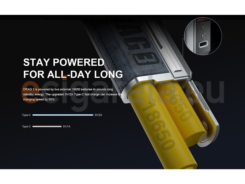 Samotný Grip VooPoo DRAG 3 pohání hned dvě baterie typu 18650 (Nejsou součástí balení). Pokročilý Gene.Fan 2.0 Chip dodává maximální výkon až 177W a celou řadu pokročilých funkcí. Nový chip přináší také bleskurychlé žhavení, a to za rovných 0,001s, kontinuální stabilní výkon a inteligentní režim SMART, který podle odporu použité žhavící hlavy nastaví správný výkon. Tuto funkci ocení především začínající uživatelé, ale i pokročilejší vapeři, kteří nechtějí ztrácet čas složitějším nastavováním. Zcela nový režim SUPER pak dodá okamžitý boost, což zajistí obrovskou produkci páry kdykoliv si budete přát. RBA režim je pak zkratkou pro klasický VW režim s možností nastavení výkonu v rozmezí neskutečných 5 - 177W. Pro opravdové profesionály je pak možné nainstalovat také režim TC (Temperature Control), který můžete získat aktualizací firmware, která je k dispozici na stránkách výrobce VooPoo. Tyto všechny funkce a nastavení zobrazuje velmi přehledný a velký 1,8" palcový TFT displej, který dominuje celému zařízení. K ovládání všech funkcí i samotnému žhavení slouží tři ovládací tlačítka, které jsou umístěny na čelním panelu nad i pod displejem.