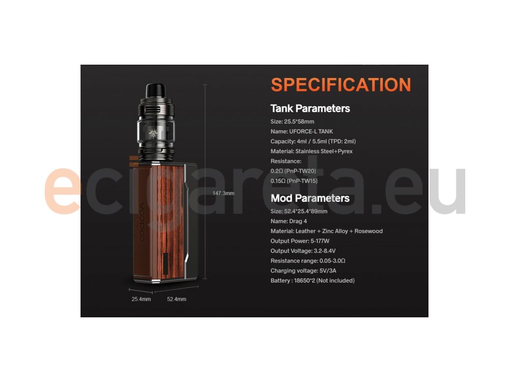 Není určeno pro náplně obsahující nikotin! V nadčasovém designu zakomponovaného do masivního dřeva přichází již čtvrtá generace ostříleného gripu Drag 4. Po vložení dvou monočlánků typu 18650 Vás uvítá čip GENE.TT 2.0 prostřednictvím přehledného a barevného displeje. Zařízení poskytuje několik režimů vapingu včetně nového úsporného režimu ECO a TC. S multifunkčním spínacím tlačítkem můžete aktivovat QS zámek pro uzamčení výkonu nebo pro uzamčení zařízení. Super rychlé nabíjení obstarává systém USB-C. Výrobce k této sadě přidělil nový clearomizer UFORCE-L o objemu 5,5ml, který disponuje inovativní 3-otvorovým přívodem vzduchu. Jeho uživatelsky nejlepší vlastností je kompatibilita se žhavícími hlavami řady PnP, včetně nového typu TW20 Mesh = bohatší chuť, hustý mrak a delší životnost.
