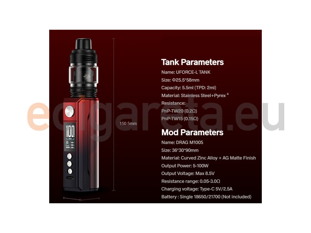 Není určeno pro náplně obsahující nikotin! VOOPOO DRAG M100S je nový jednobateriový grip, jehož základ vychází ze 4. generace série VOOPOO DRAG. Prvotřídní tělo baterie ze speciální zinkové slitiny s doplňky z masivního dřeva a matných antireflexních povrchů je zárukou prvotřídních zážitků z vapingu. Po vložení monočlánku typu 18650/21700 vás přivítá čip GENE.TT 2.0, který nabízí nastavitelný režim pro výkon až 100W, nastavení teploty spirál (TC) nebo ECO mod. Mezi jeho další přednosti patří ochrana proti zkratu, přehřátí a moderní USB-C port pro rychlé nabíjení. Výrobce k této sadě přidělil clearomizer UFORCE-L o objemu 5,5ml, který disponuje inovativním 3-otvorovým přívodem vzduchu. Jeho uživatelsky nejlepší vlastností je kompatibilita se žhavícími hlavami řady PnP.