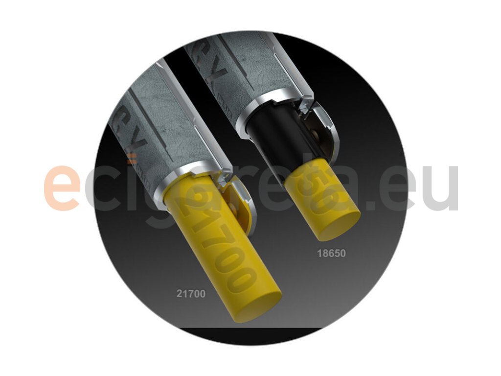 Uvnitř těla modu se nachází slot pro velkou baterii typu 21700. Můžete rovněž použít také baterii 18650 s adaptérem, který se nachází v balení. Díky slotu pro externí baterii se můžete těšit na vysoký výstupní výkon dosahující až 100 W. Nesmí chybět celá řada bezpečnostních ochran. Baterii si můžete navíc pohodlně dobíjet přímo v modu díky přítomnosti USB-C portu na těle.