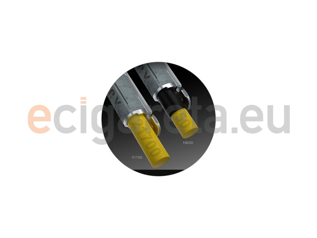 Uvnitř těla modu se nachází slot pro velkou baterii typu 21700. Můžete rovněž použít také baterii 18650 s adaptérem, který se nachází v balení. Díky slotu pro externí baterii se můžete těšit na vysoký výstupní výkon dosahující až 100 W. Nesmí chybět celá řada bezpečnostních ochran. Baterii si můžete navíc pohodlně dobíjet přímo v modu díky přítomnosti USB-C portu na těle.