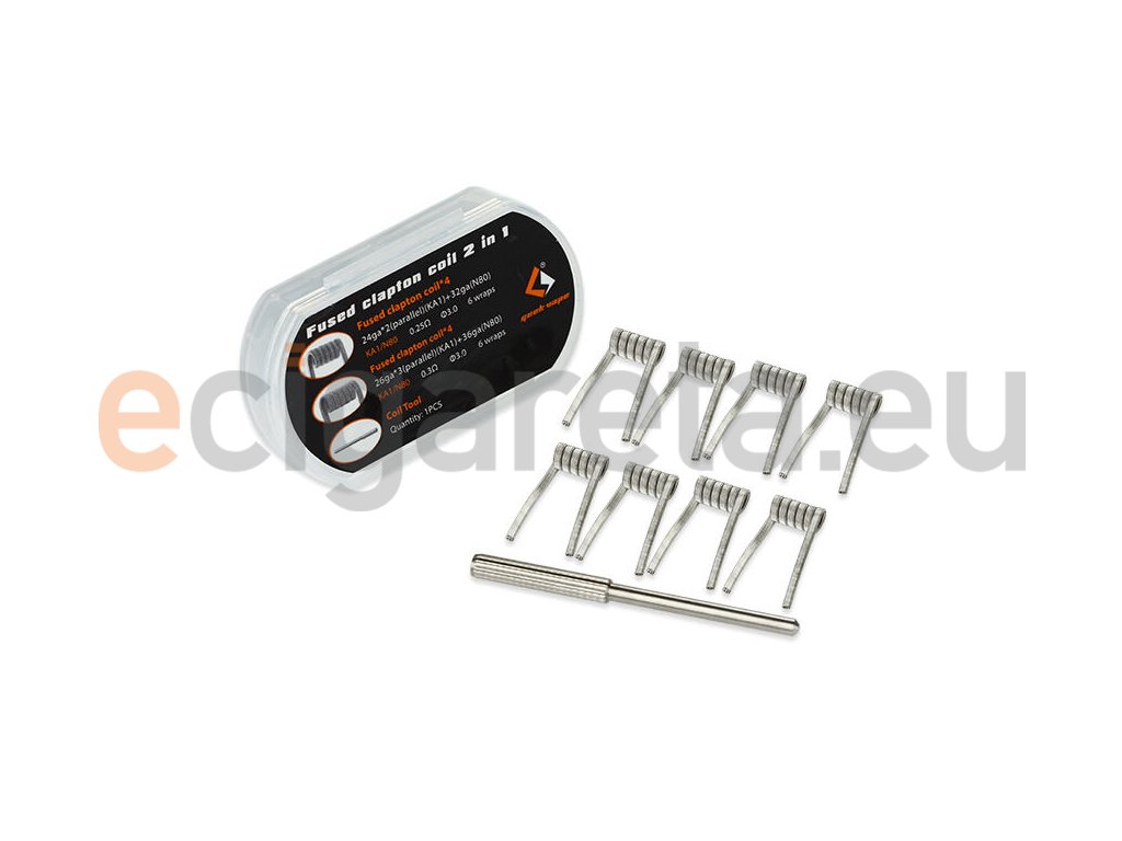 Set 2 v 1 od výrobce GeekVape představuje spirálky typu Fused Clapton. V balení naleznete clapton spirálky s kanthalovým jádrem složeným ze dvou, nebo tří paralelních kanthalových drátů (KA1). Kanthal je omotaný drátem z Nichromu (N80). V balení naleznete rovněž nástroj pro úpravu a motání spirálek.