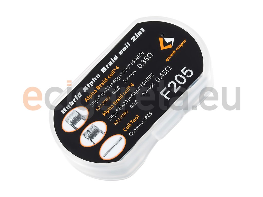Již hotové, předmotané kanthalové spirálky od výrobce GeekVape, nesoucí označení Hybrid Alpha Braid. V tomto případě jde o unikátně spletené spirálky, které v sobě ukrývají jak kanthalový, tak nichromový odporový drát. V balení naleznete také speciální nástroj se dvěma různými průměry, takže si můžete spirálky jednoduše uzpůsobit.