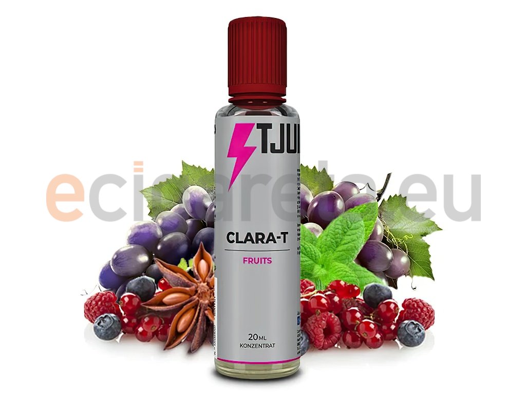 Clara-T je nádherně svěží chuť, která kombinuje sytě červené bobule v podobě borůvek, rybízu a zralých malin, se šťavnatými tóny hroznů. Výdech doplňuje lehký mentol, díky němuž si tuto jasnou příchuť můžete vychutnávat po celý den.