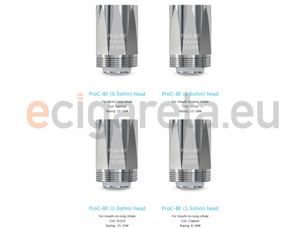Atomizer ProC-BF o odporu 0,6ohm (15W-28W) ze 100% organické bavlny, navržený speciálně pro styl potahování ústa/plíce. Ve spolupráci s Cubis 2 clearomizerem přináší objem nádržky 3,5ml. Kompatibilní s BF (Joyetech Cubis, Cubis PRO, Cuboid Mini, eGrip II, AIO, Elitare, CUBIS 2, CuAIO D22, Cubox AIO), Green Sound GS Torpedo AIO